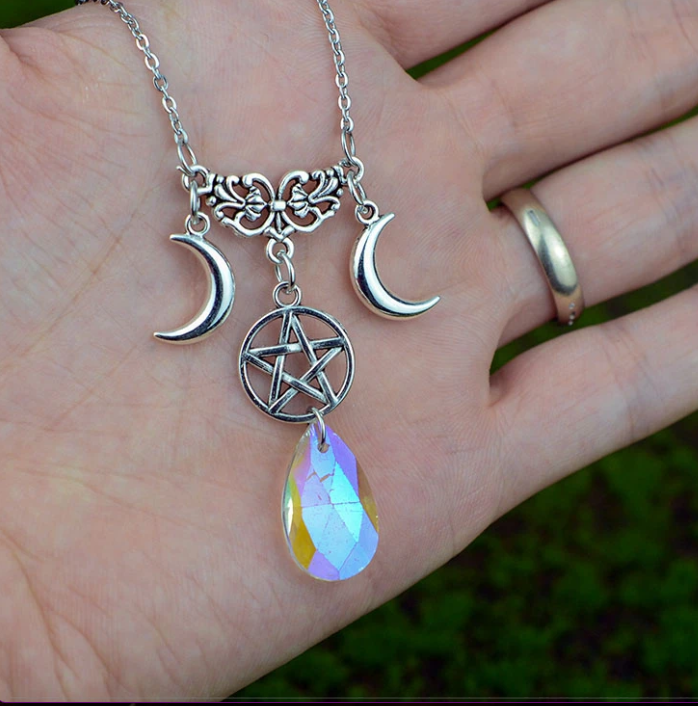 Witches Pentacle / Pentagram Crescent Moon Crystal Necklace