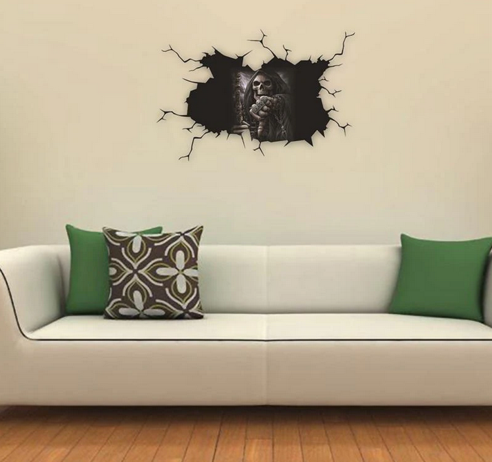 Creepy reaper decal is warning you with a thumbs down... Appears through a broken window. Vinyl..